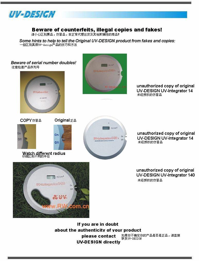 本UV能量計(jì)能承受較高的溫度,在輸送帶上不超過10秒,耐溫110℃. 安裝/操作 a. 打開ON開關(guān),則LCD(顯示屏)是顯示為零。 b. 將UV能量計(jì)放置于UV燈燈源附近,盡量做到以其背面對準(zhǔn)燈源(因能量計(jì)的能量感受器在背面),照射時(shí)間作適當(dāng)延長。 c. 直到能量計(jì)的顯示屏上有測量顯示,例如800毫焦耳/平方厘米。(800mj/cm2) d. 關(guān)掉能量計(jì)開關(guān)(OFF),或?qū)@示屏的值設(shè)置為零。